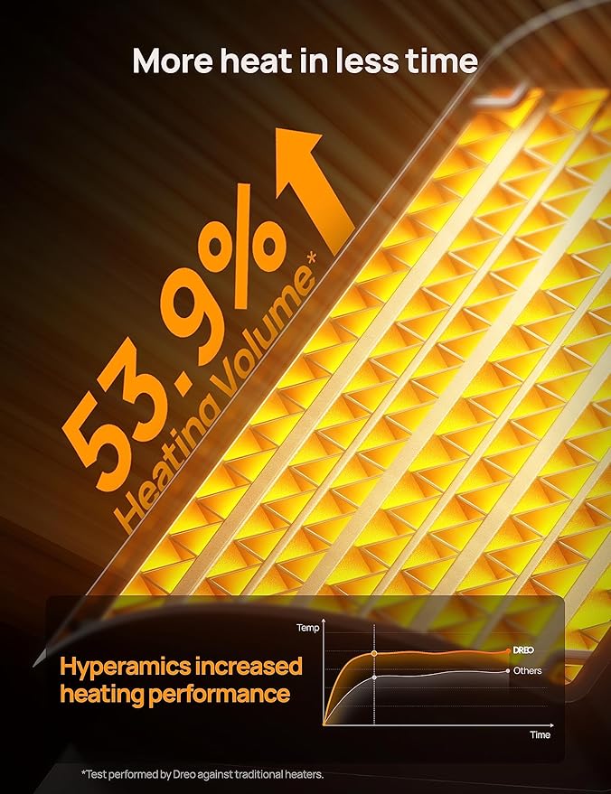 - Powerful heat that fits everywhere: Dreo space heaters for indoor combines Hyperamics 1500W advanced PTC system with a new heat funnel design to deliver heat within seconds and enhance warm air circulation for up to 200% farther reach than traditional heaters.