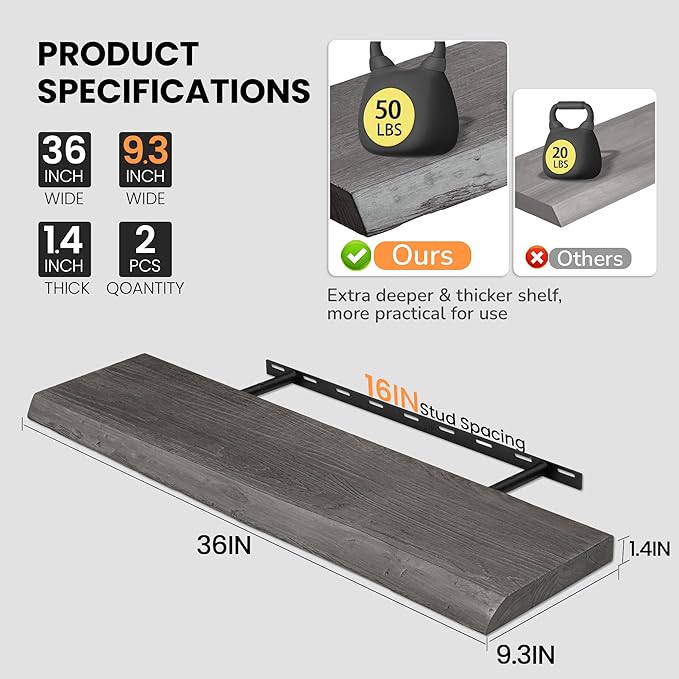 - 9.3" DEEP SOLID ELM WOOD: Unlike others, Fun Memories live-edge floating shelves are handcrafted from reclaimed elm wood and measure 36" x 9.3" x 1.4" each. Featuring natural grain, knots, and color variation, they add warmth and rustic charm to any space. Mount them vertically, side-by-side, or in corners for a clean, stylish look