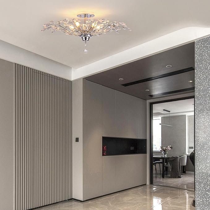- ▶Modern Design: The chrome ceiling light fixture is beautifully decorated. Features a smooth chrome finish frame with clear K9 crystals to capture and reflect the light from the bulb, pure, romantic, shining like diamond, brings an superior and sophisticated ambiance in any room. Illuminate your home with a touch of modern elegance using this stunning 5-light crystal flush mount ceiling light!