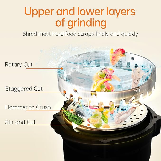 - FINER GRIND: The 1/2 HP garbage disposal features a 2-stage grinding system designed for efficient and multi-dimension grinding. With a 2600 RPM DC motor and high-quality, durable stainless steel grinding components, it can effectively turn pericarp and scraps into particles after 2 stages of grinding. You can see there are no large debris left in the grinding chamber. You don't have to worry about clogged drains!