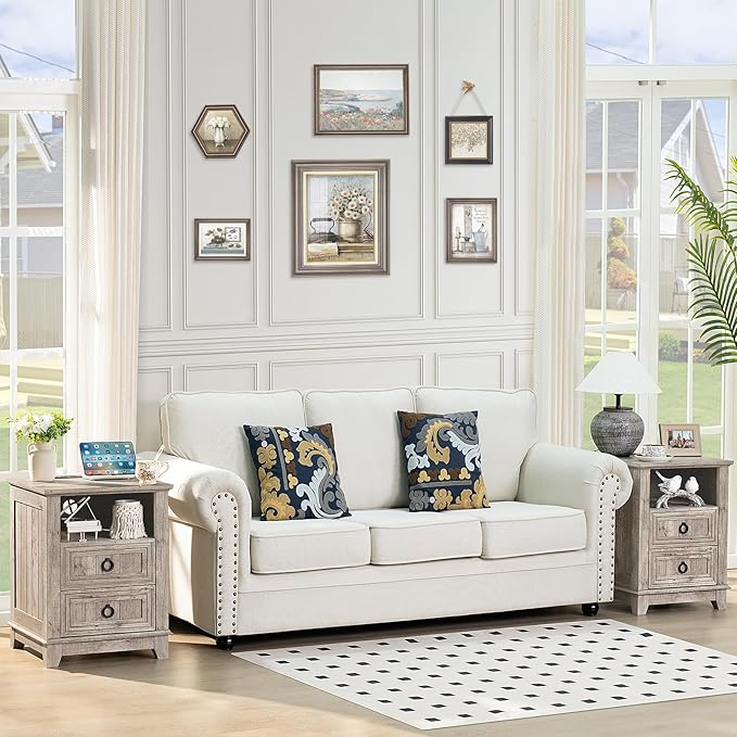 - 【End Table with charging station】 : The side table with storage is equipped with 2 standard AC sockets and 2 USB ports. This tall nightstand provides great convenience when you use electronic devices, keeping your charging devices within reach. A 2.3-inch round hole is designed on the back to facilitate the arrangement of socket power cables and charging cables, making the desktop more tidy.