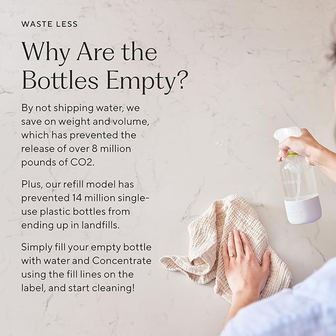 - SIMPLE, SUSTAINABLE CLEANING: Our refillable bottle system reduces plastic waste and lowers CO2 emissions, helping you contribute to a healthier planet without compromising on performance. By switching to this kit, you can eliminate dozens of single-use plastic bottles each year, supporting a sustainable cleaning routine that delivers sparkling clean results.