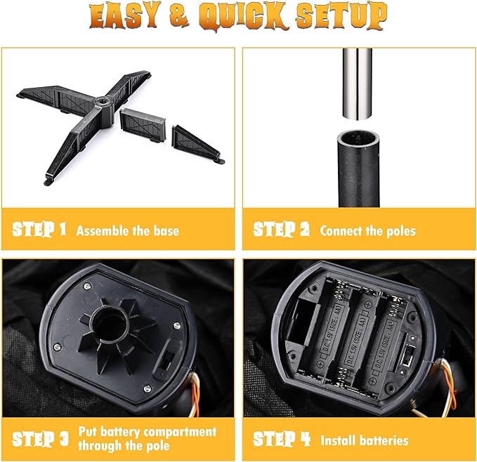 - Easy & Quick Setup - No tool is required for easy installation in minutes, just assemble the base, connect the poles, put the battery compartment through the pole, and extend the ghost decoration; Features adjustable pole height by fitting together different numbers of poles to suit your needs, and 4-leg base for better stability
