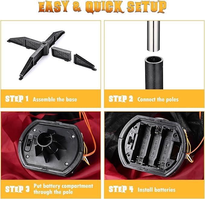 - Easy & Quick Setup - No tool is required for easy installation in minutes, just assemble the base, connect the poles, put the battery compartment through the pole, and extend the zombie decoration; Features adjustable pole height by fitting together different numbers of poles to suit your needs, and 4-leg base for better stability
