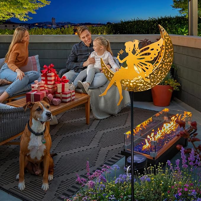 - Unique Fairy Garden Accessories: The moon solar lights design with fairy statue ornament and crackled glass ball, when night falls, the soft light surrounds the moon to make fairy more lovely and beautiful in your garden. The first thing to catch your eye is the elegant fairy sitting on the moon, her wing looks like real butterfly and the delicate rose flower on her hand really match Your garden. Itβs a great addition to your patio that bring peace, good luck and blessings to you and your family