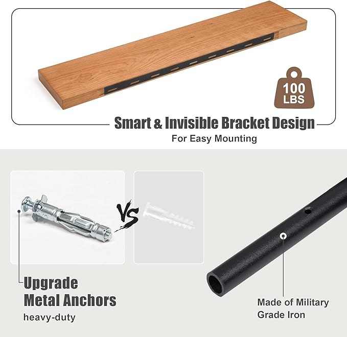 - STURDY & FUNCTIONAL: Not only does the floating shelf showcase the natural grain pattern of the wood, but with unique heavy-duty metal mounting brackets, our floating shelf can hold up to 100 lbs per shelf. The shelves have a flat surface and stable construction, so they are suitable for any room in your home.