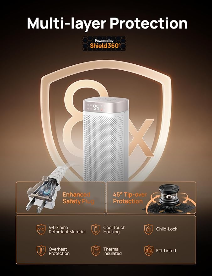 - Peerless safety and reliability: Enjoy top safety with this indoor heater, featuring Shield360° protection, tip-over and overheat safeguards, a 24-hour auto-off function, and V-0 flame-retardant materials. ETL-listed for your peace of mind.