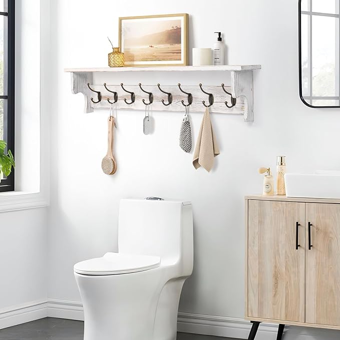BECHAEO 35.8'' Wood Coat Rack Wall Mount with Shelf, White Wall Coat Rack with Hooks, Farmhouse Rustic Coat Hooks for Entryway Bathroom Hallway Kitchen Bedroom