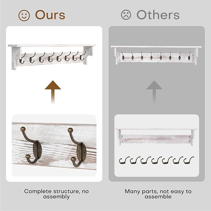 - Easy to Install: This coat rack wall mount with shelf is assembled, 8 metal hooks pre-installed, very easy to install on the wall, wall coat rack's packaging with detailed installation instructions and accessories, your installation will be very easy