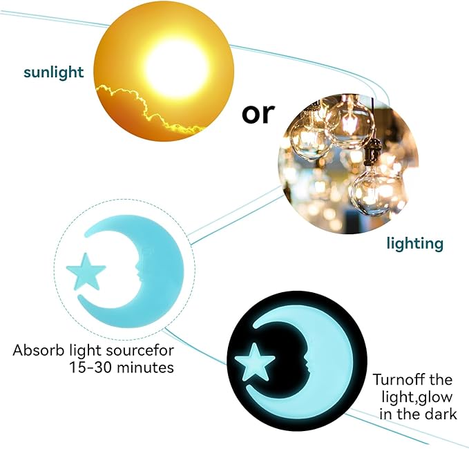 - High quality materials: Our glow ceiling stars is made of plastic, not easily broken or deformed, odorless, safe and reliable that children can touch it directly without worrying; They only need to absorb light during the day to emit a soft glow, very beautiful