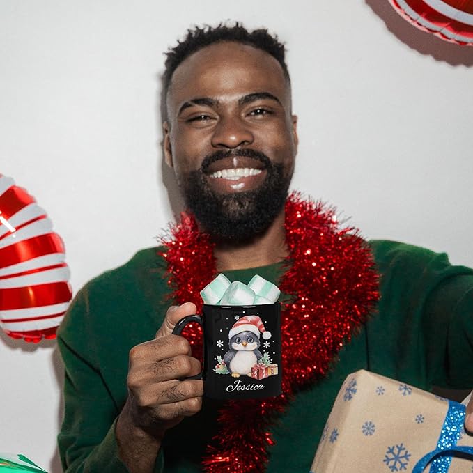 - š UNIQUE DESIGN MUG: Celebrate the holidays with this "Customized Christmas Themed Black Cup" featuring a penguin in a Santa hat surrounded by gifts and festive greenery. Click "Customize Now" to add a name, creating a delightful and personalized gift for the holiday season. This black ceramic mug is great for enjoying your favorite winter beverages.