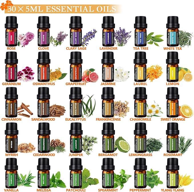 - 【30 Essential Oils】: TOP 30 100% natural oils. The dark bottle will help keep the oils fresh and also guard against light degradation.No harsh ingredients, Not blended Fragrance Oils, No additives,NO fillers.
