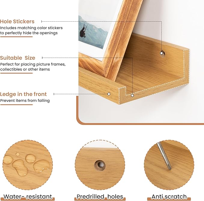 - Enhanced Stability Design: Featuring a secure lip at the front, these floating shelves prevent items from slipping or falling, confidently supporting up to 40 lbs, making these MDF wood shelves ideal for showcasing cherished items.