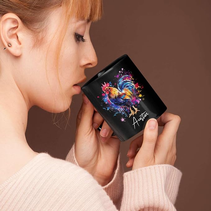 Customized Name Rooster Coffee Mug - Gift for Men Women, Personalized Black Cup, Unique Chicken Ceramic 11oz 15oz, Funny Colorful Themed
