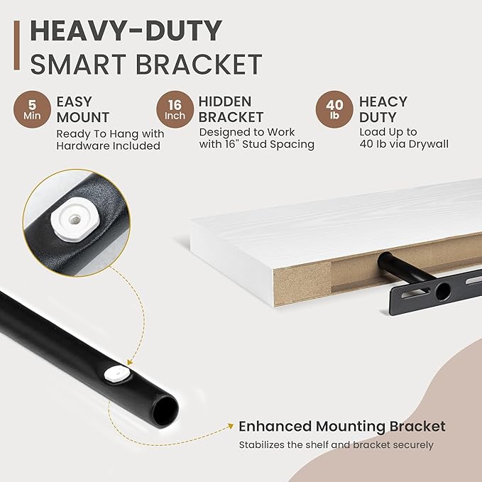 - [STABLE & SECURE INSTALLATION]: Equipped with a robust, hidden mounting bracket, these 36 inche floating shelves provide solid support for your items. Designed for easy, secure installation, they include all necessary hardware for a firm, wobble-free setup, so you can confidently display decor, photos, or functional items with style.