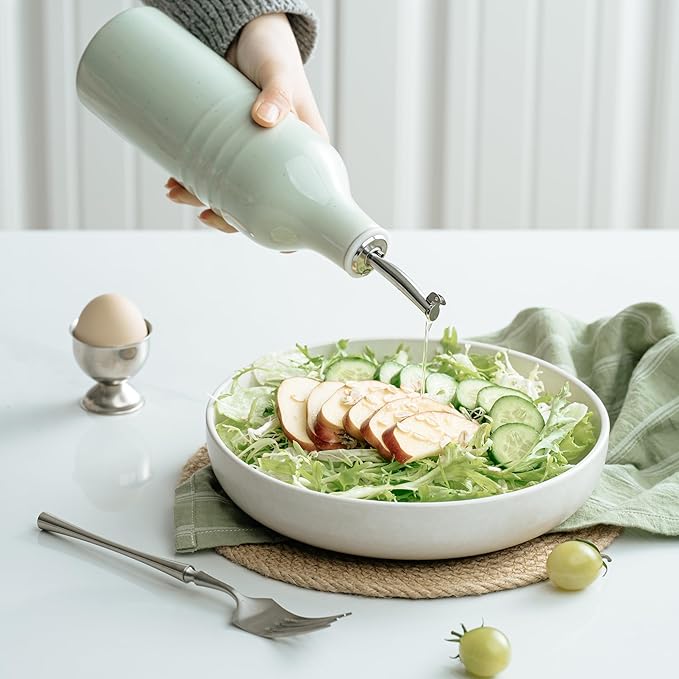 - ELEGANT OLIVE OIL DISPENSER BOTTLE - Our 16-ounce ceramic oil dispenser is handmade and batch-fired at extremely high temperatures, forming a smooth glaze and providing a resilient