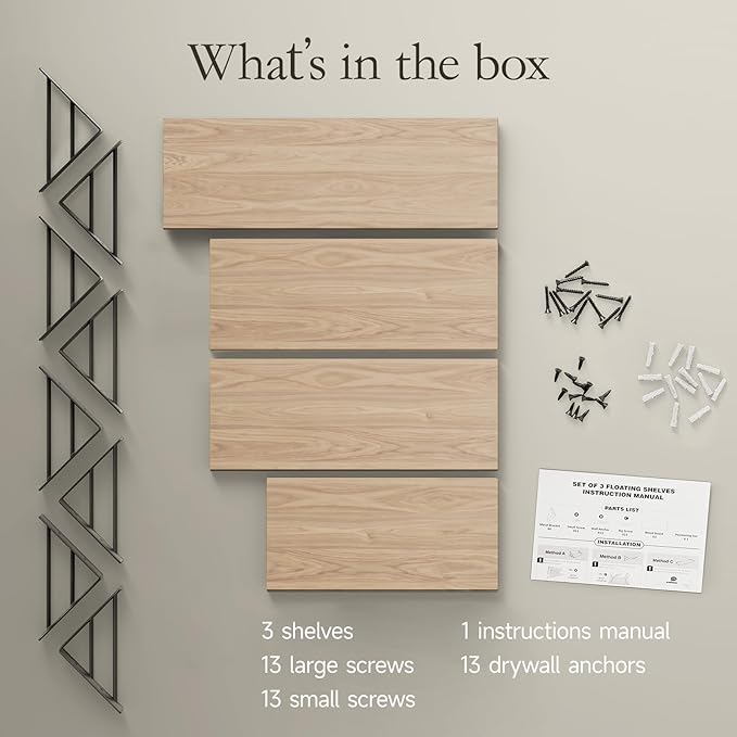 - **Three different size Floating Shelves for All** : Large: 16.5 Γ 5.5 Γ 4.6 inches; Medium: 14.2 Γ 5.5 Γ 4.6 inches; Small: 11.4 Γ 5.5 Γ 4.6 inches. These floating shelves are wider and sturdier than others to safely hold collectibles, photos, small plants and showcase favorite dishes or build your own coffee bar. Easy to assemble with all necessary hardware included according to the instruction steps.