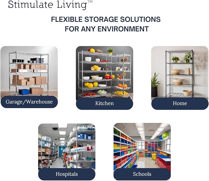 - â FLEXIBLE USAGEâ Our Stimulate Living Wire Shelving is designed to be flexible and adaptable to a wide range of settings. It can be used in warehouses to store heavy equipment, in kitchens to hold cooking utensils, in garages to organize tools, in hospitals and laboratories to store medical supplies, in offices to keep files and documents, in retail stores to display merchandise, in restaurants to store kitchenware, in factories to hold raw materials, and more.