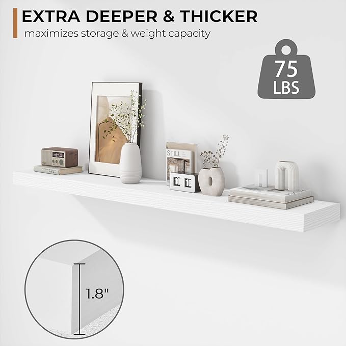 - Extra Deeper & Thicker - Each board measures 48"W x 8"D x 1.8"H. Extra deeper and thicker design in order to bring maximizes storage space and weight capacity, even hold up to 75 lb each. This floating shelf taking up zero square feet, reduces clutter and highlights décor in compact spaces.