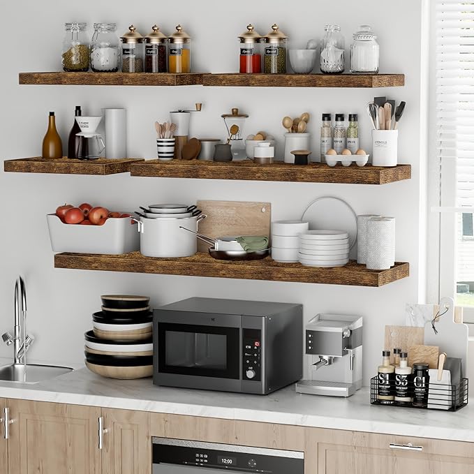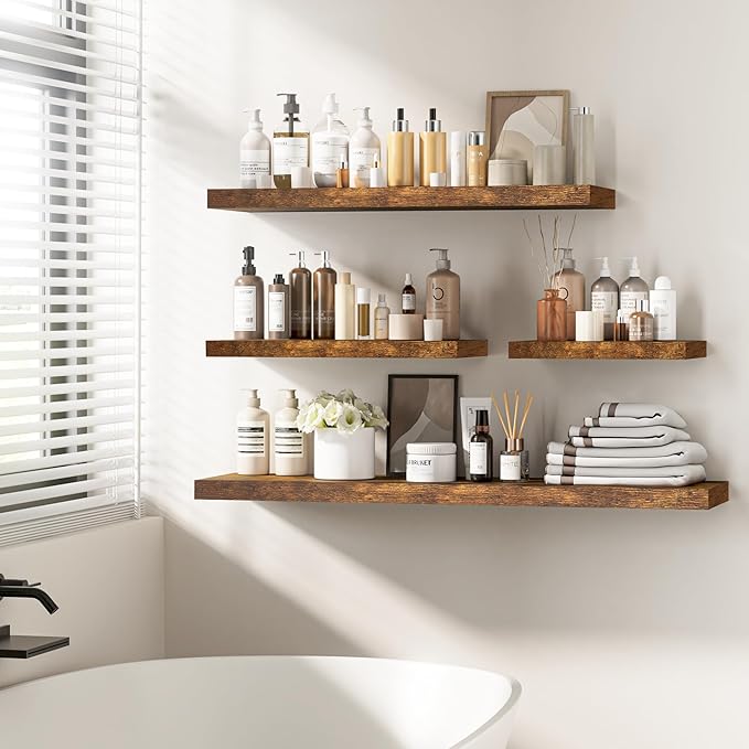 - Versatile & Multi-Scene Functionality: Our floating shelves are available in a variety of sizes and thicknesses, allowing you to choose the perfect fit for your space. Use them in the bathroom to store beauty products, hair care items. In the bedroom, they can hold books, cosmetics, and personal items. In the kitchen, they’re perfect for spices, jars, or small utensils. Or display photo frames, trophies, or collections in the living room. These shelves efficiently use wall space to create a tidier, more spacious feel in any room.