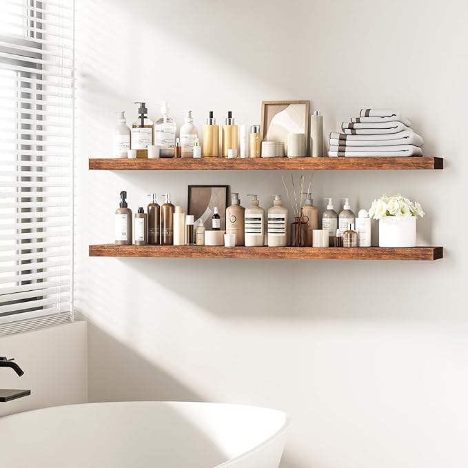 - Versatile & Multi-Scene Functionality: Our floating shelves are available in a variety of sizes and thicknesses, allowing you to choose the perfect fit for your space. Use them in the bathroom to store beauty products, hair care items. In the bedroom, they can hold books, cosmetics, and personal items. In the kitchen, they’re perfect for spices, jars, or small utensils. Or display photo frames, trophies, or collections in the living room. These shelves efficiently use wall space to create a tidier, more spacious feel in any room.