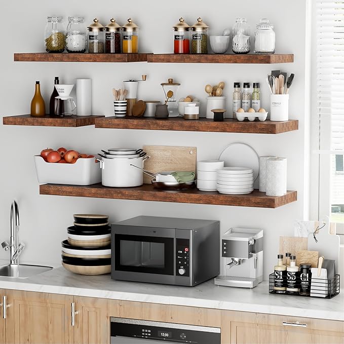 - Versatile & Multi-Scene Functionality: Our floating shelves are available in a variety of sizes and thicknesses, allowing you to choose the perfect fit for your space. Use them in the bathroom to store beauty products, hair care items. In the bedroom, they can hold books, cosmetics, and personal items. In the kitchen, they’re perfect for spices, jars, or small utensils. Or display photo frames, trophies, or collections in the living room. These shelves efficiently use wall space to create a tidier, more spacious feel in any room.