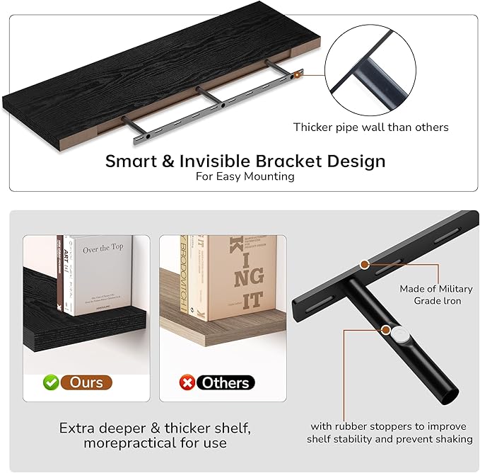 - Extra Deeper & Thicker - Each board measures 48"W x 12"D x 1.8"H. Extra deeper and thicker design in order to bring maximizes storage space and weight capacity, even hold up to 75 lb each. This floating shelf taking up zero square feet, reduces clutter and highlights décor in compact spaces.