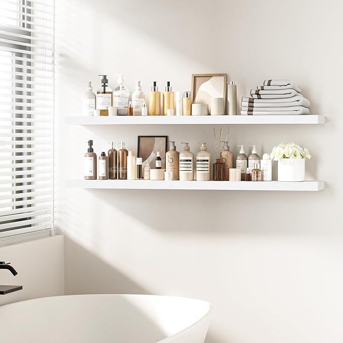 - Versatile & Multi-Scene Functionality: Our floating shelves are available in a variety of sizes and thicknesses, allowing you to choose the perfect fit for your space. Use them in the bathroom to store beauty products, hair care items. In the bedroom, they can hold books, cosmetics, and personal items. In the kitchen, they’re perfect for spices, jars, or small utensils. Or display photo frames, trophies, or collections in the living room. These shelves efficiently use wall space to create a tidier, more spacious feel in any room.