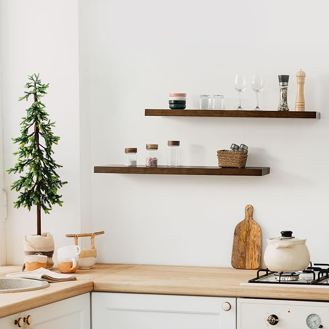 Fun Memories Farmhouse Floating Shelves - 8 Inch Deep Rustic Wood Wall Shelf - Premium Solid Pine Wood Storage Shelf for Kitchen Living Room Bedroom - 30" W x 8" D - Set of 2 - American Walnut