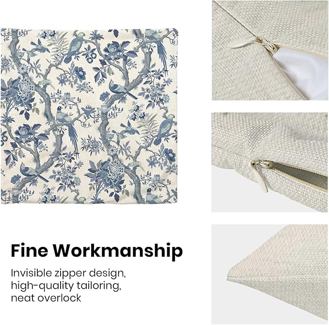 - 【Square Pillow Covers Size】 Chinoiserie flower birds pillow case set includes 2 pcs of farmhouse couch pillow covers (NO Pillow). Home decor farmhouse pillow covers measures 18x18 inch/ 45x45 cm. All the floral decor throw pillow covers have a hidden zipper. It is easy to insert or remove the pillow core to replace the spring pillowcase. Easy to clean and wash, sturdy and not easy to damage.