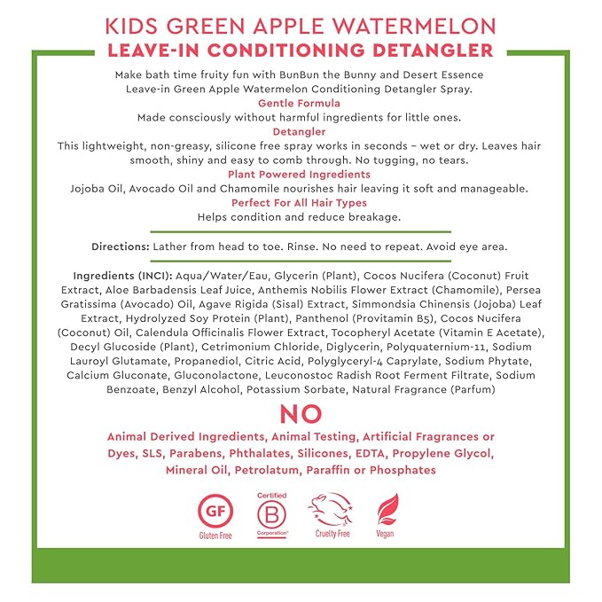 - Gentle Kid-Friendly Formula made consciously for kid's developing hair; Our leave in conditioning detanglng spray is made without artificial fragrance or harmful ingredients for sensitive skin.