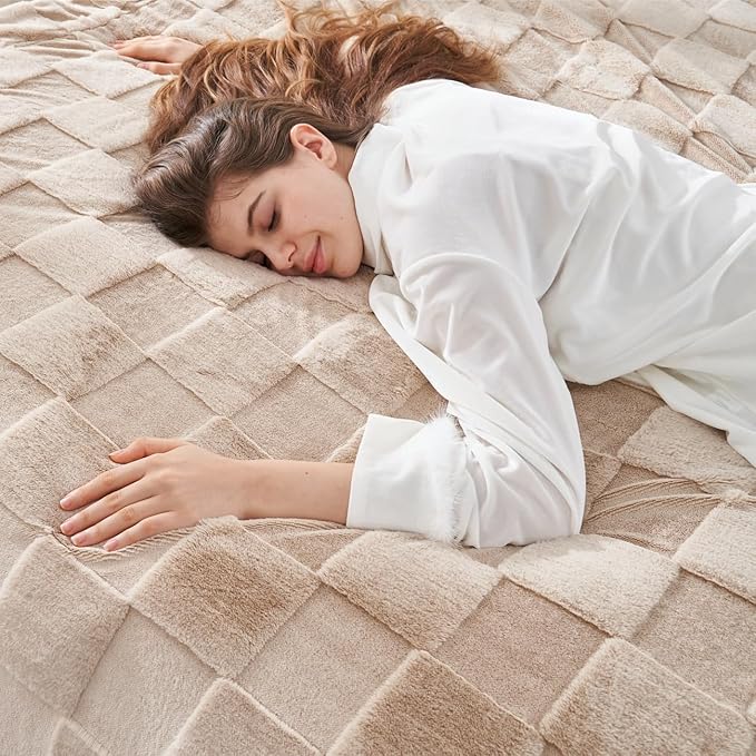 Cozy Bliss Checkered White Faux Rabbit Fur Throw Blanket, Soft Fuzzy Fluffy Minky Cream Furry Blankets for Couch, Bed (Tan, Queen(90" x 90")