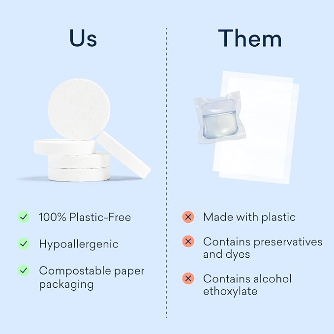 - POWERFUL PLASTIC-FREE LAUNDRY TABLET. The first-ever 100% plastic-free laundry detergent tablet. Our powerful dry-form tablet is tried, tested, and proven to lift the toughest stains—from grass and coffee to food and makeup—without any harsh chemicals. Just drop one tablet directly into the washing machine drum and let it work its magic. For large loads, double the power with two tablets instead of one.