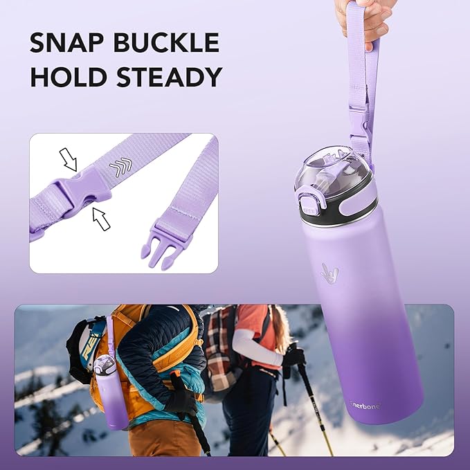 Enerbone 24 oz Insulated Water Bottle, Stainless Steel Bottle with Carrying Strap, Double-Wall Vacuum Insulation Design, Leakproof Sports Bottle with Straw, Keep Drinks Cold or Hot for Hours