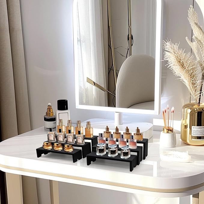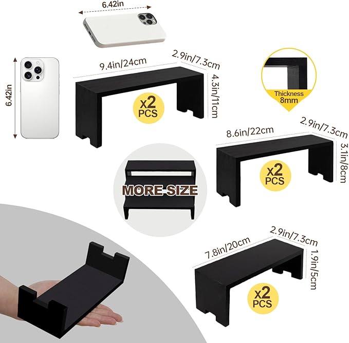 - 【Wooden Tierd Risers for Display】🎁: This 2 set 3 tier small display shelf for cupcakes or vendors has stackable nesting design, so the wooden display risers easily access as desktop storage racks,also they has strong load-bearing capacity for more kinds perfumes, collectible figures,kitchen condiment bottles, bathroom toiletries because of varieties size of (L7.8''/20cm-8.6''/22cm-9.4''/24cm)XW2.9'' /7.3cm