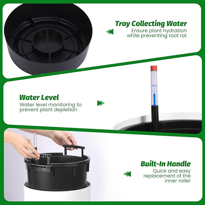- HIDDEN WATER STORAGE TANK: The self watering pots for indoor plants feature a hidden water storage tank, which effectively stores water to meet the needs of your plants while maintaining the neat appearance of the planter and enhancing the overall aesthetics. The self-priming system ensures an even and continuous water supply, especially suitable for plants that prefer a relatively moist environment, avoiding issues like plant rot caused by improper watering.