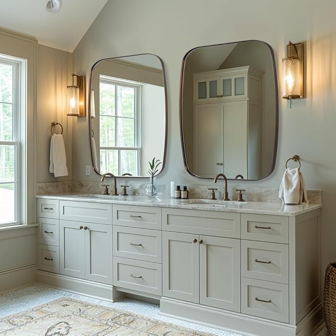 - Excellent Performance: A sleek, modern stainless steel metal frame surrounds a unique oblong mirror; sets it apart from traditional oval or rectangular mirrors; brushed bronze finish complements your bathroom; adds light and space to the room
