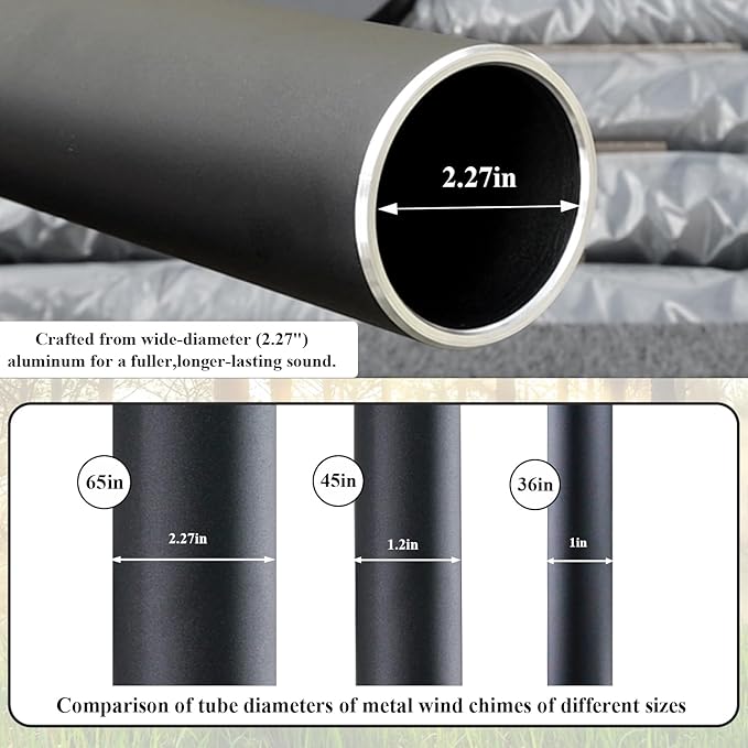 - 65 Inch large Wind Chimes - The longest tube of the large wind chimes is 40.9 Inch,diameter is 2.27 Inch.6 aluminum powder-coated tubes,every metal tube of this large wind chime is hand-tuned by our professional tuning experts to achieve a superior musical performance.Heavy duty nylon cording high density striker for a clear tone and resonances.