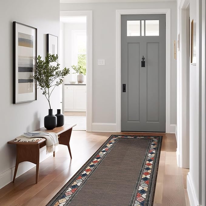 Beverly Rug Outdoor Runner Rug 2x7 Modern Floral Bordered Area Rugs for Indoor and Outdoor Patio Easy to Clean Non Shedding Living Room Porch Garden Washable Outside Carpet (2 x 7 Brown)