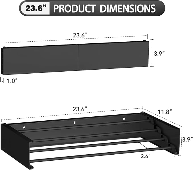 - Space-Saving Design - This laundry drying rack is adopted with collapsible design, so you can fold it when not in use; The compact and retractable wall-mounted design maximizes limited space, adds elegance to your space, and can help free up your floor space; Unfolded Size: 31.5"(L) x 15.7"(D) x 3.9"(H); Folded Size: 31.5"(L) x 1.0"(D) x 3.9"(H)