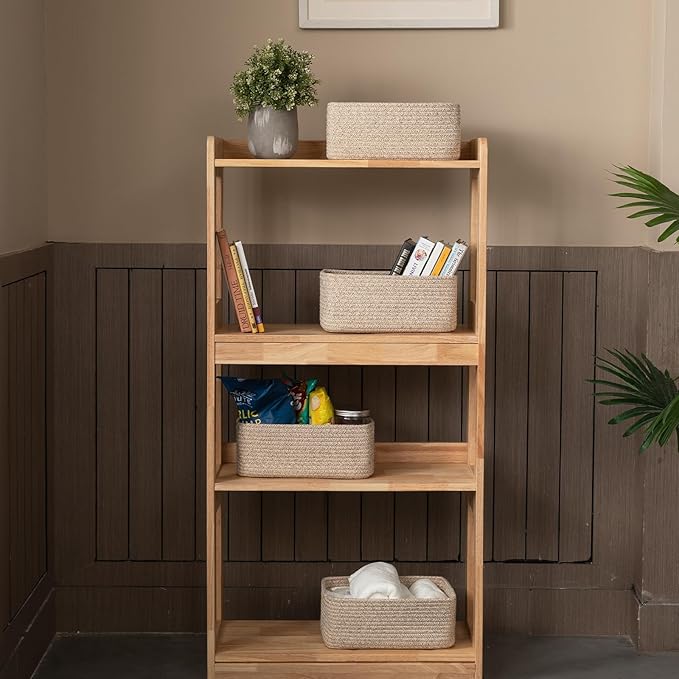 - [Cute & Small Decorative Storage Baskets]: These 4 Pack woven baskets measuring 13” x 8.66” x 5.11”, the fantastic woven rope baskets with mini size, which can work as shelf baskets for organizing, cute and practical for home decor, making your home more cozy and attractive