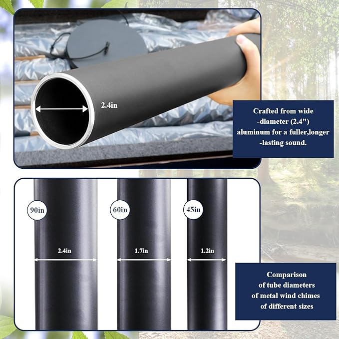 - 90 Inch large Wind Chimes - The longest tube of the large wind chimes is 53.54 Inch,diameter is 2.4 Inch.6 aluminum powder-coated tubes,every metal tube of this large wind chime is hand-tuned by our professional tuning experts to achieve a superior musical performance.Heavy duty nylon cording high density striker for a clear tone and resonances.