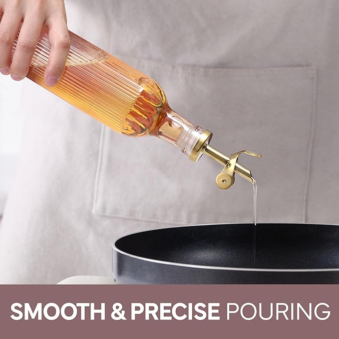 - Beautiful and Functional - Our colored glass oil dispensing bottles, with elegeant colors, gold tops and gold wire rack, will elevate your kitchen. Don't use just any oil bottle, upgrade the way you cook. That's our mission.