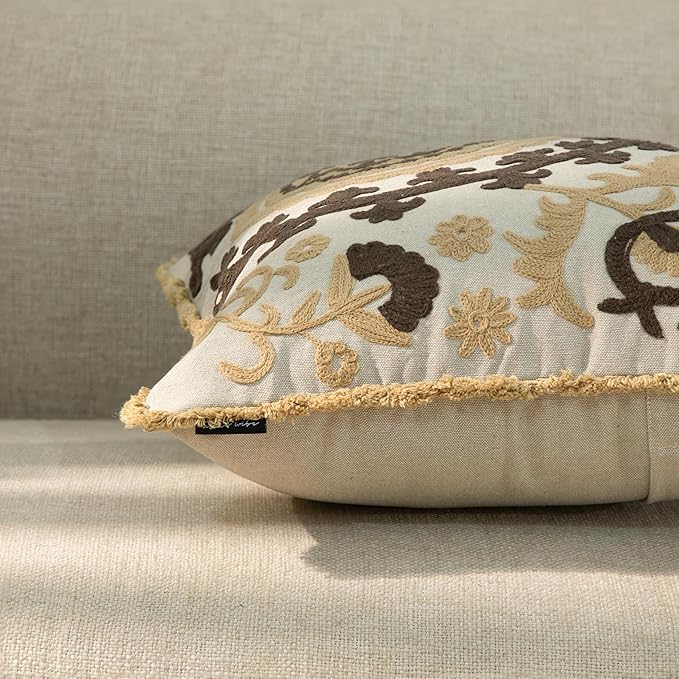 Embroidered Floral Mandala Vintage Indian Cotton Decorative Embroidery Throw Pillow Covers, Fringes Lace Cushion Cover, Pillow Case for Sofa Couch Bed Chair 18" x 18"