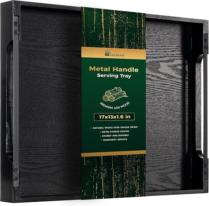 Axeman Wooden Serving Tray with Metal Handles|Ottoman Tray for Breakfast, Bed, Couch|17x13in Ash Wood Coffee Table Trays|Food Drinks Decorative Storage Boards for Ottoman Kitchen, Black