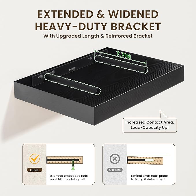 - UPGRADED MOUNTING SYSTEM-The extended supporting bars on the metal brackets ensure our wall shelves remain sturdy, preventing any wobbling or sagging. Plus, the included plastic plugs guarantee the shelves to stay firmly in place