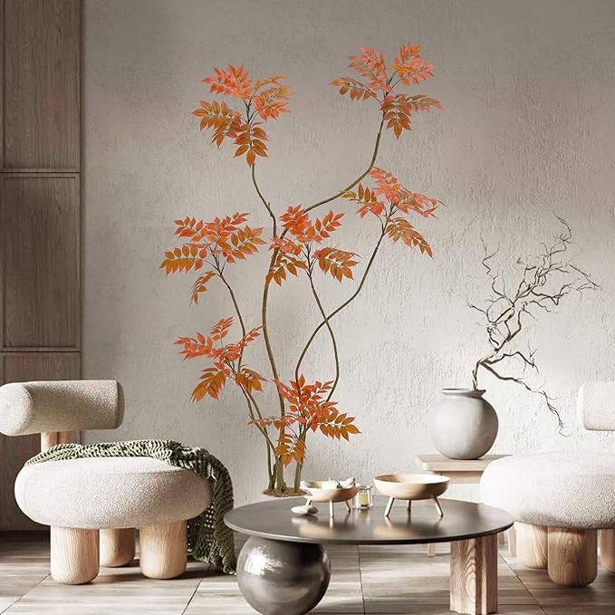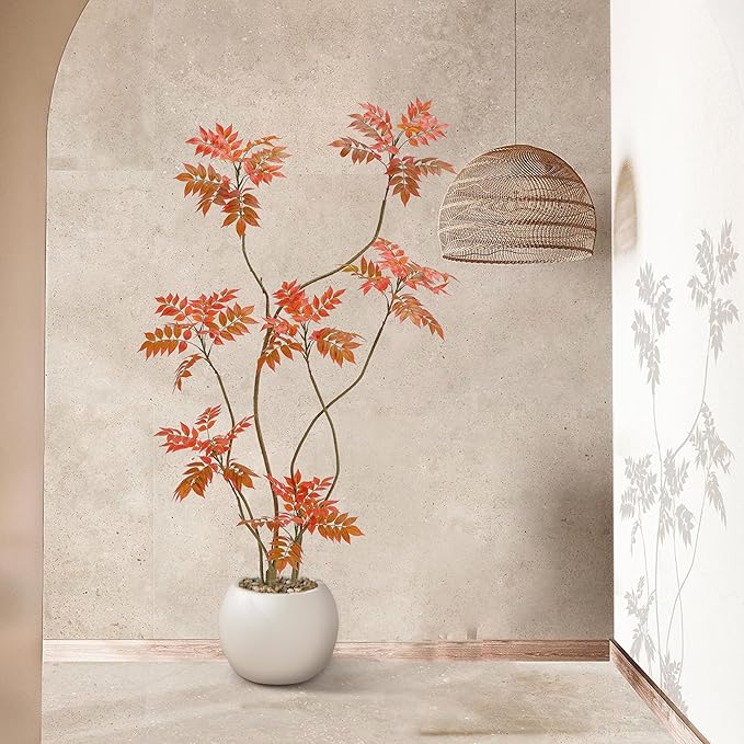 - Home Decor Accents: This 6ft/70in tall faux sumac tree contains 500 pieces real touch leaves who made of silk and each leaf has veins on it. Inclus a white planter(10"H x 10"W). The interior of the planter is made of sturdy concrete and the surface is decorated with non-falling coloured pebbles and the base use anti-tip tilt protection for greater stability