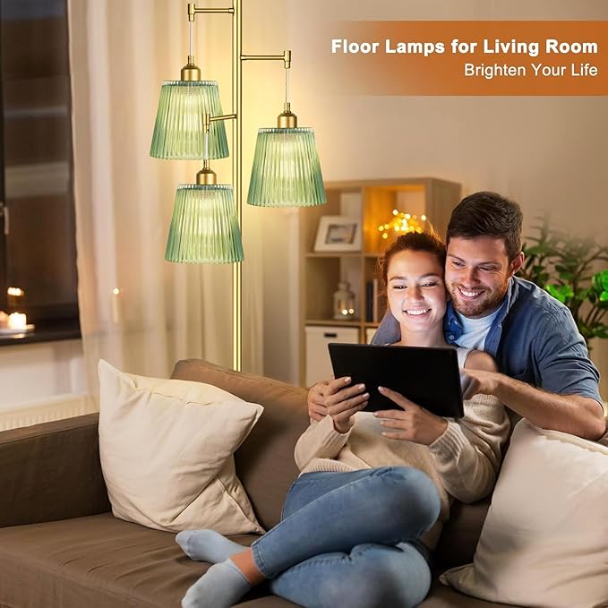Gold Floor Lamp for Living Room,Bedroom,Mid Century Modern Standing Lamp Brass Tree 3 Light Tall Floor Lamps Vintage Retro Floor Lights Glass Green Flower Lamp Shade Farmhouse Boho Bohemian