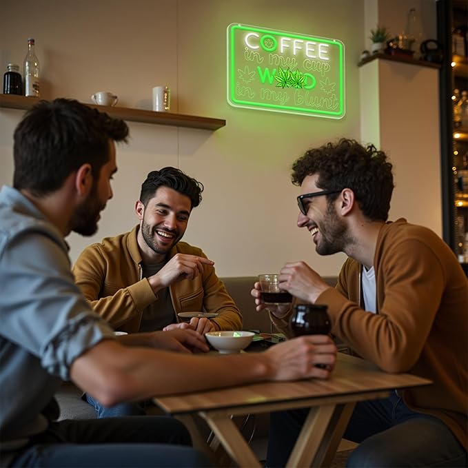 - 【Coffee Neon Sign】 "Coffee in my cup, Weed in my blunt". This neon sign is a unique storefront decoration sign. The unique slogan and design can make your shop stand out. Coffee, blunt, and weed all symbolize pleasure, which will definitely help you attract a large number of customers and leave a great impression on your guests.