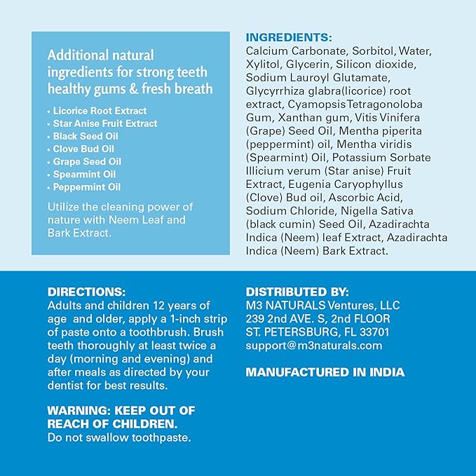 - No more plaque with neem: M3's flouride free neem toothpaste targets surface stains on your teeth that may have latched on from different food and drinks you consume on a daily basis. Best used twice a day and after meals, or as recommended by your dentist.